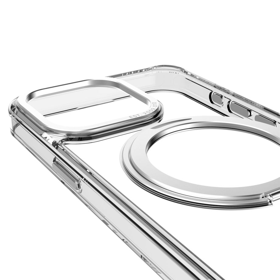 Ein schlichter, minimalistischer Look für das iPhone: Diese transparente Hülle aus recyceltem Polycarbonat schützt das iPhone zuverlässig und bringt gleichzeitig das Design des Smartphones zur Geltung. Dabei sticht als besonderes Highlight der MagSafe-Ring heraus, der ausgeklappt und im beliebigen Winkel gedreht werden kann. Der integrierte Stand ist aus stabilem und langlebigem Aluminium hergestellt. Ein erhöhter Rand bewahrt das Display vor Kratzern und das stoßsichere TPU schützt das iPhone bei Stößen und Stürzen. Ein anthrazitfarbener, metallener Kameraring dient als optisches Highlight und schützt gleichzeitig die Kamera des iPhones. Dank dem integrierten Loop Stand ist die Schutzhülle MagSafe-kompatibel und lässt sich unkompliziert und sicher an MagSafe-Accessoires ausrichten. Die Metallknöpfe sorgen für eine besonders gute Handhabung.