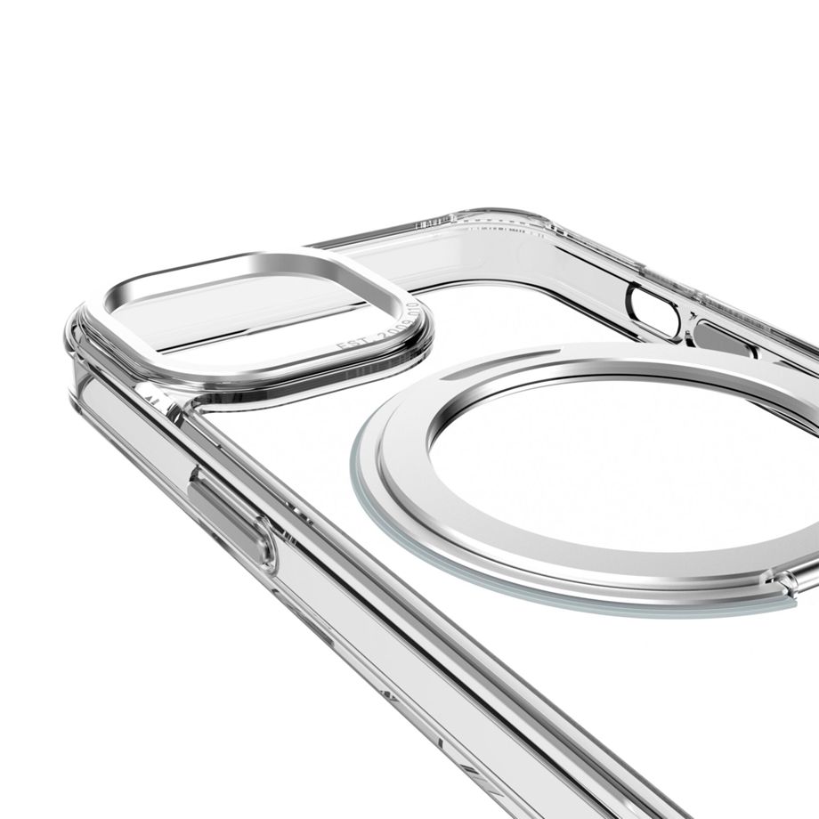 Ein schlichter, minimalistischer Look für das iPhone: Diese transparente Hülle aus recyceltem Polycarbonat schützt das iPhone zuverlässig und bringt gleichzeitig das Design des Smartphones zur Geltung. Dabei sticht als besonderes Highlight der MagSafe-Ring heraus, der ausgeklappt und im beliebigen Winkel gedreht werden kann. Der integrierte Stand ist aus stabilem und langlebigem Aluminium hergestellt. Ein erhöhter Rand bewahrt das Display vor Kratzern und das stoßsichere TPU schützt das iPhone bei Stößen und Stürzen. Ein anthrazitfarbener, metallener Kameraring dient als optisches Highlight und schützt gleichzeitig die Kamera des iPhones. Dank dem integrierten Loop Stand ist die Schutzhülle MagSafe-kompatibel und lässt sich unkompliziert und sicher an MagSafe-Accessoires ausrichten. Die Metallknöpfe sorgen für eine besonders gute Handhabung.