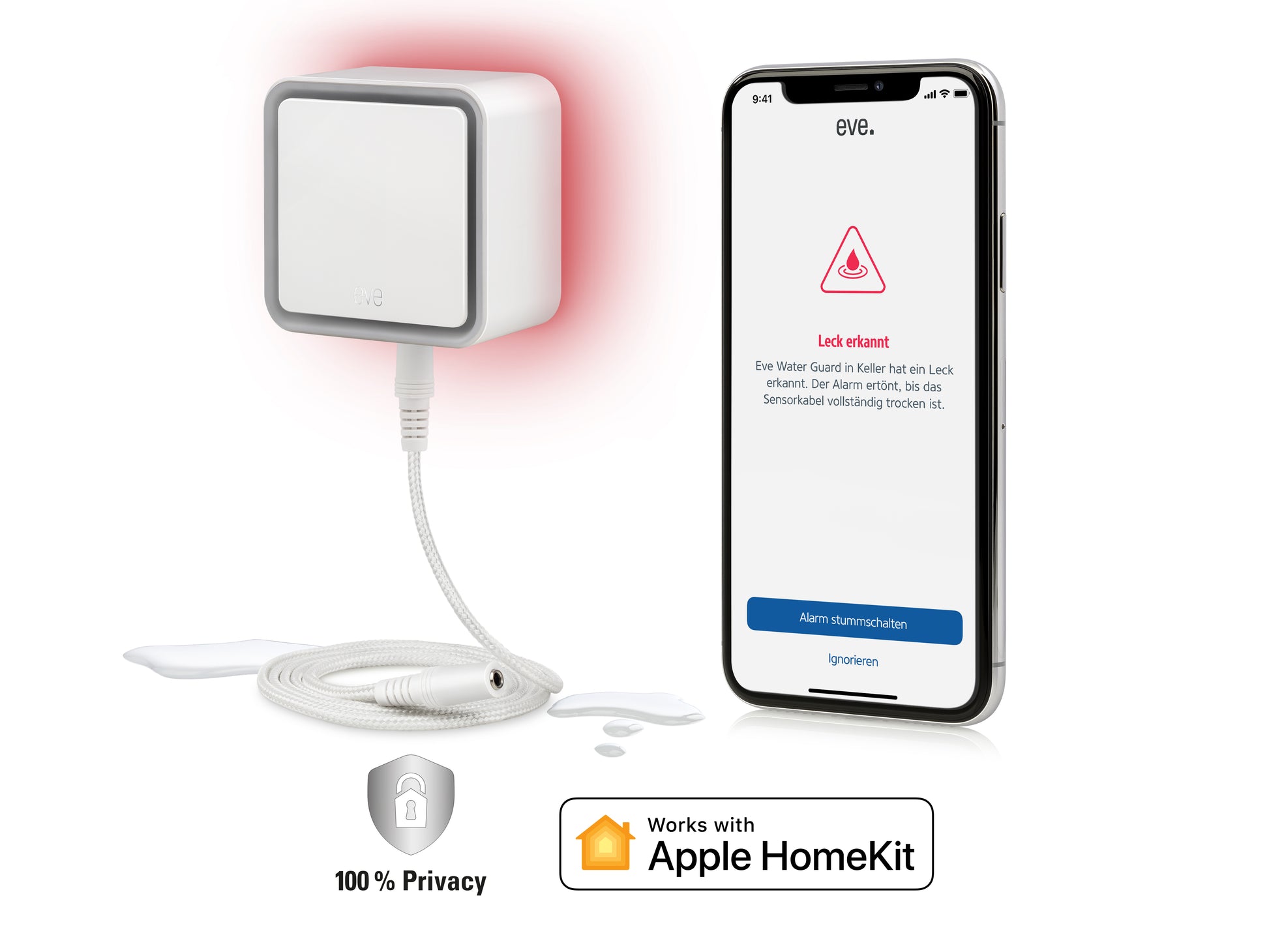 Das Haus verlassen, obwohl die Waschmaschine noch läuft. Gewissheit, dass auch hinter der Sockelblende kein Wasser steht. Wenig genutzte Kellerräume immer im Blick. Der smarte Wassermelder Eve Water Guard erkennt austretendes Wasser und alarmiert dich sofort - visuell, akustisch und per App auf deinem iPhone. Das mitgelieferte, verlängerbare 2 m-Kabel dient in seiner vollen Länge als Sensor und überwacht so großflächig deine Räume. Und die Eve-App erinnert dich regelmäßig, das tadellose Funktionieren zu testen. Beuge teuren Wasserschäden vor und bringe mit Eve Water Guard ein wichtiges Stück Sicherheit in dein Zuhause.