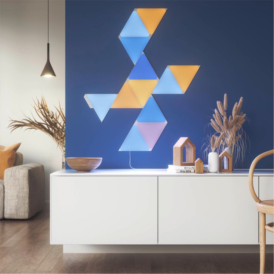 Die Nanoleaf Shapes Triangles vereinen intelligente Beleuchtung mit kreativem Design. Die dünnen, dreieckigen LED-Lichtpaneele lassen sich dank ihres modularen Stecksystems zu leuchtenden Kunstwerken an der Wand oder Decke gestalten. Dank der Connect+-Technologie lassen sich die verschiedenen Formen der kompletten Shapes-Reihe von Nanoleaf miteinander zu atemberaubenden Lichtmosaiken kombinieren. Durch Berührungsinteraktionen, Musik-Licht-Synchronisation in Echtzeit und die Screen-Mirror-Funktion können einzigartige Lichteffekte erzeugt und ein beeindruckendes Farbambiente geschaffen werden. Das Lichtsystem ist mit Weißlicht und einer Auswahl von über 16 Millionen Farben ausgestattet und lässt sich einfach durch Klebestreifen und ohne Bohren anbringen. Die Steuerung erfolgt per App, Steuerungsgerät, über Touch-Gesten oder Sprachassistenten wie Siri, Google oder Alexa. In der Nanoleaf-App lassen sich eigene Szenen und Wiedergabelisten kreieren. Weitere Integrationen in Smart-Home-Systeme unter anderem über HomeKit, SmartThings und IFTTT sind möglich. Auch ohne WLAN und die Nanoleaf-App lassen sich eine große Auswahl an vorprogrammierten Farbszenen über das Steuergerät auslösen.