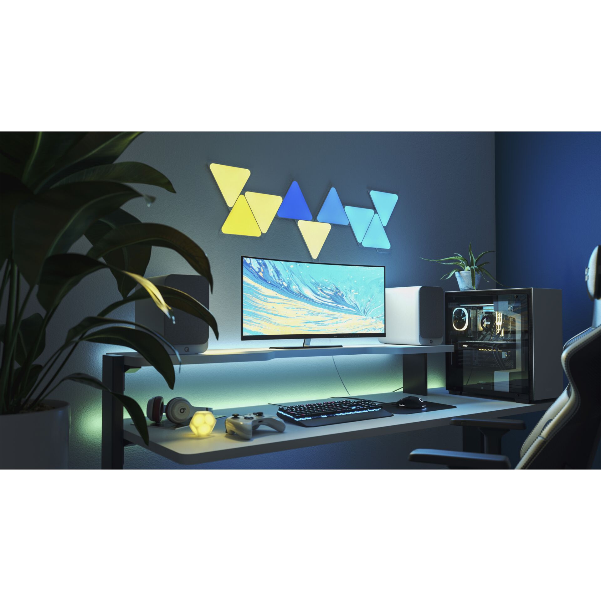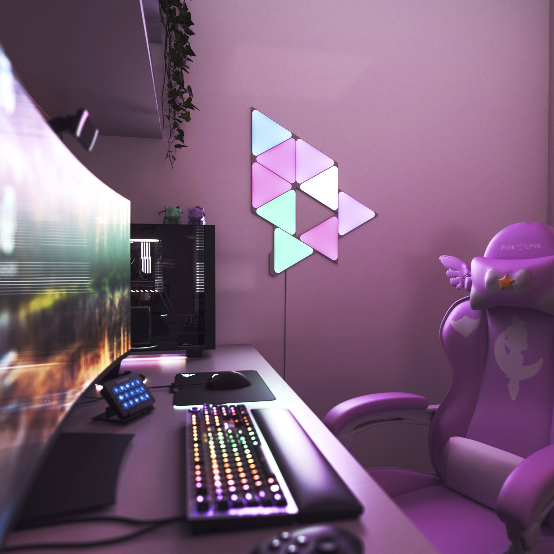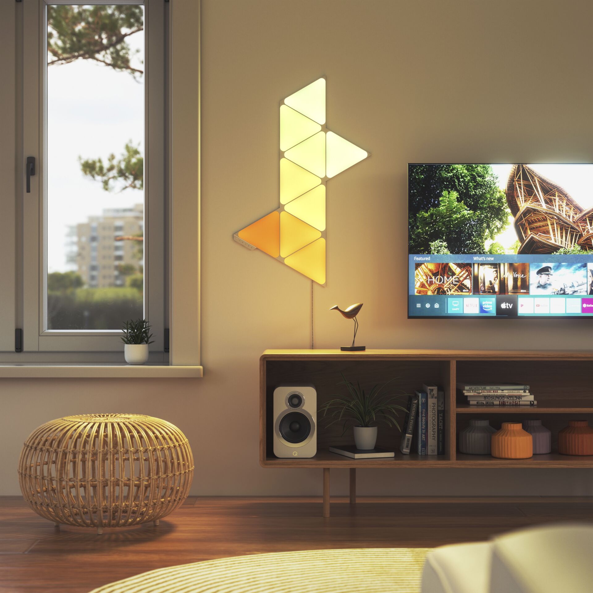 Die Nanoleaf Shapes Triangles vereinen intelligente Beleuchtung mit kreativem Design. Die dünnen, dreieckigen LED-Lichtpaneele lassen sich dank ihres modularen Stecksystems zu leuchtenden Kunstwerken an der Wand oder Decke gestalten. Dank der Connect+-Technologie lassen sich die verschiedenen Formen der kompletten Shapes-Reihe von Nanoleaf miteinander zu atemberaubenden Lichtmosaiken kombinieren. Durch Berührungsinteraktionen, Musik-Licht-Synchronisation in Echtzeit und die Screen-Mirror-Funktion können einzigartige Lichteffekte erzeugt und ein beeindruckendes Farbambiente geschaffen werden. Das Lichtsystem ist mit Weißlicht und einer Auswahl von über 16 Millionen Farben ausgestattet und lässt sich einfach durch Klebestreifen und ohne Bohren anbringen. Die Steuerung erfolgt per App, Steuerungsgerät, über Touch-Gesten oder Sprachassistenten wie Siri, Google oder Alexa. In der Nanoleaf-App lassen sich eigene Szenen und Wiedergabelisten kreieren. Weitere Integrationen in Smart-Home-Systeme unter anderem über HomeKit, SmartThings und IFTTT sind möglich. Auch ohne WLAN und die Nanoleaf-App lassen sich eine große Auswahl an vorprogrammierten Farbszenen über das Steuergerät auslösen.