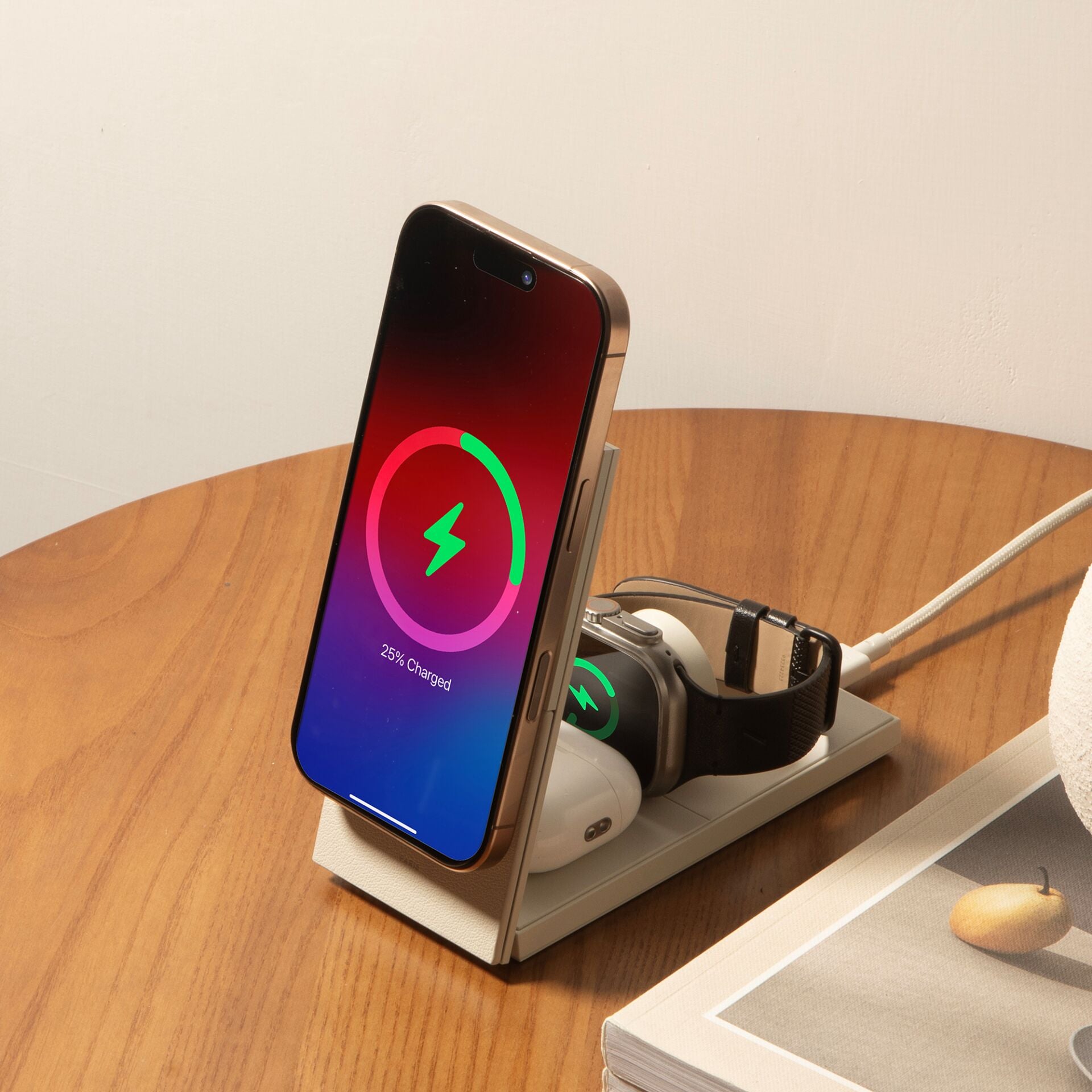 - 3-in-1 Qi2-Ladegerät zum gleichzeitigen kabellosen Laden von iPhone, Apple Watch und AirPods