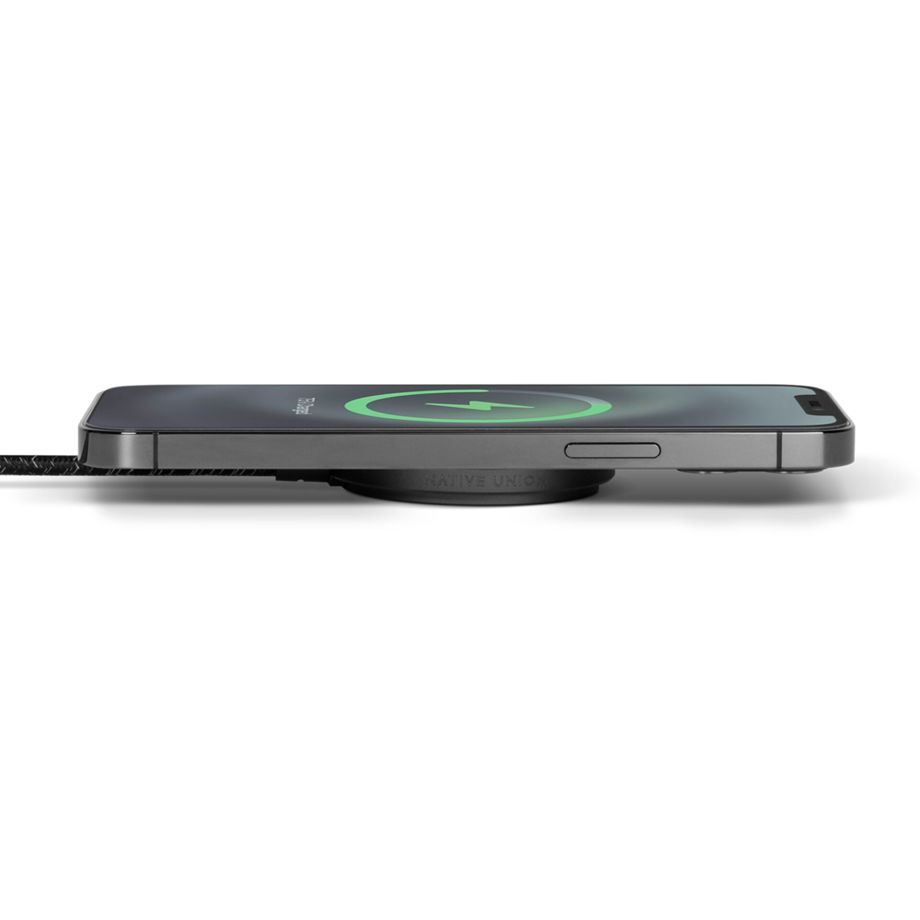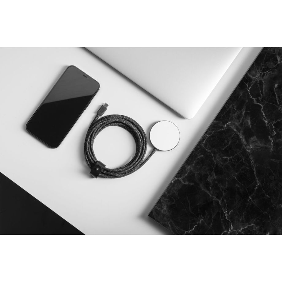 Das Native Union Snap Cable XL ist eine praktische Ladelösung für den Alltag. Das Kabel verfügt über einen USB-C-Anschluss und einen MagSafe-Ladepad. Somit hält es während des Ladevorgangs magnetisch an MagSafe-fähigen iPhones und auch Cases. Das Ladekabel ist umwickelt mit geflochtenem Nylon, wodurch es besonders robust und stabil ist. Die MagSafe-Ladefläche ist umschlossen von einer extra schlanken Aluminiumhülle. Auf der Rückseite ist das MagSafe-Pad mit Silikon versehen, um Kratzer auf Tischen zu vermeiden und außerdem ein Verrutschen des Kabels zu verhindern. Mit einer Länge von 3 Metern bietet dieses MagSafe-Kabel besonders viel Komfort. Ein integrierter Kabelbinder aus Echtleder macht es außerdem leicht, das Kabel aufzuwickeln und zu verstauen. Das Kabel lädt MagSafe-fähige iPhones mit bis zu 7,5 Watt und andere qi-fähige Geräte mit bis zu 15 Watt (die magnetische Halterung ist hier jedoch nicht gewährleistet).