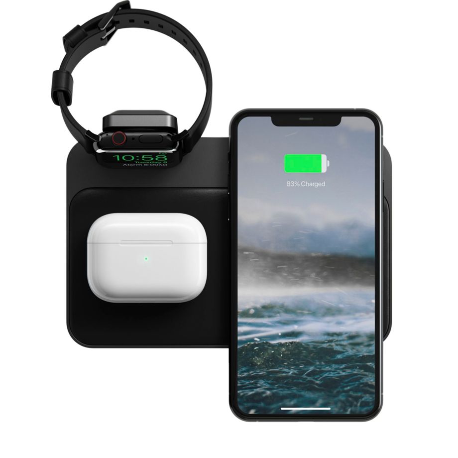 Die Base Station Apple Watch Edition von Nomad wurde designt um das Aufladen von Apple Watch, iPhone und AirPods noch einfacher und bequemer zu gestalten. Die Ladestation aus Aluminium kombiniert dabei ein schlankes und modernes Design mit einem funktionalen Hub. Bis zu fünf Geräte gleichzeitig können mit Strom versorgt werden, an der Rückseite befinden sich sowohl ein USB-A- als auch ein USB-C-PD-Anschluss. Auf der mit Echtleder überzogenen Ladefläche finden beliebige Qi-fähige Geräte einen Platz und werden dabei durch drei Ladespulen mit bis zu je zehn Watt mit Strom versorgt. Die integrierte LED zeigt an, wenn gerade Geräte kabellos geladen werden, dank eines Umgebungslichtsensors wird diese Anzeige bei Nacht gedimmt.