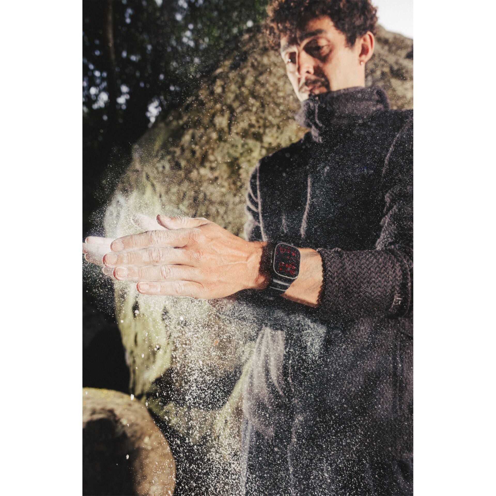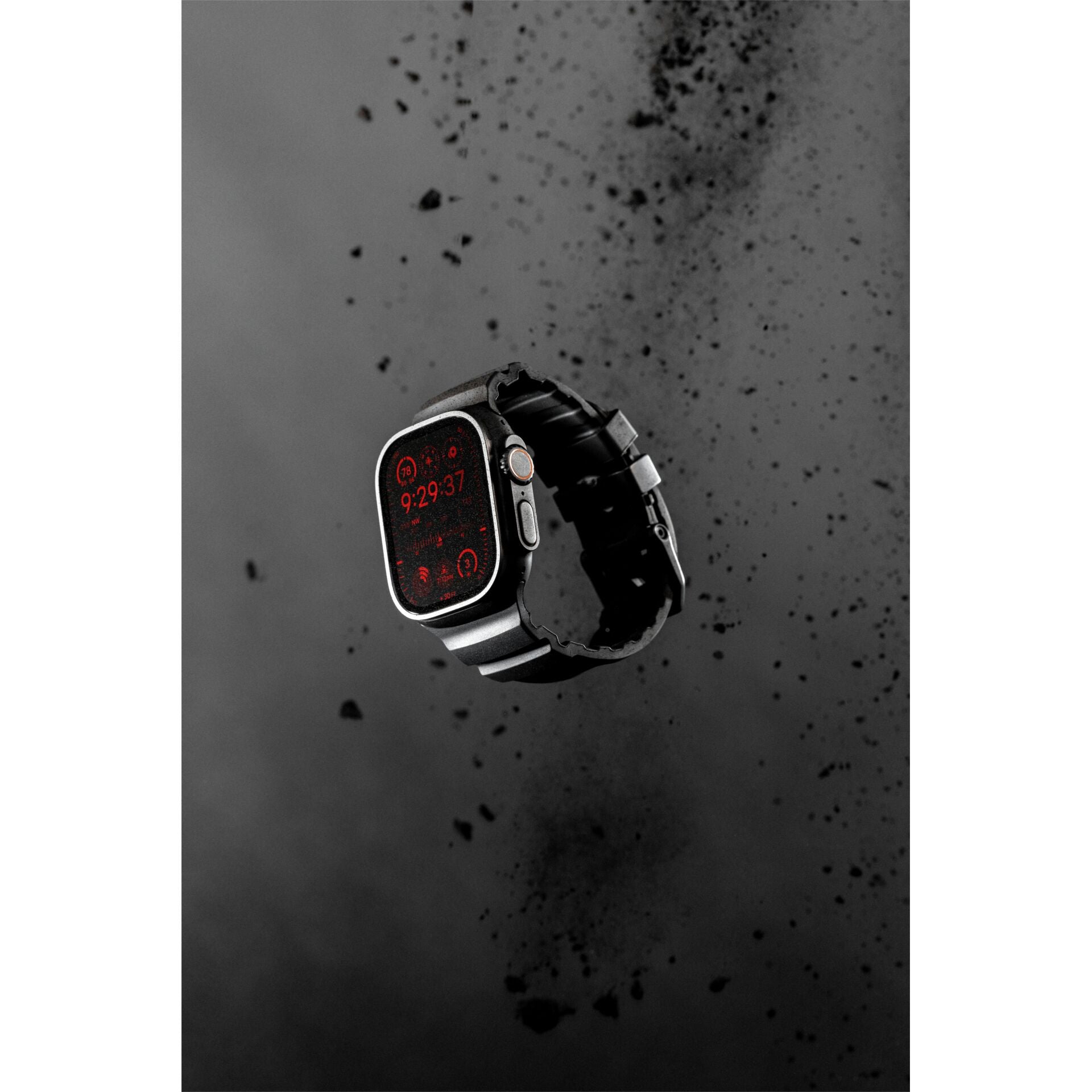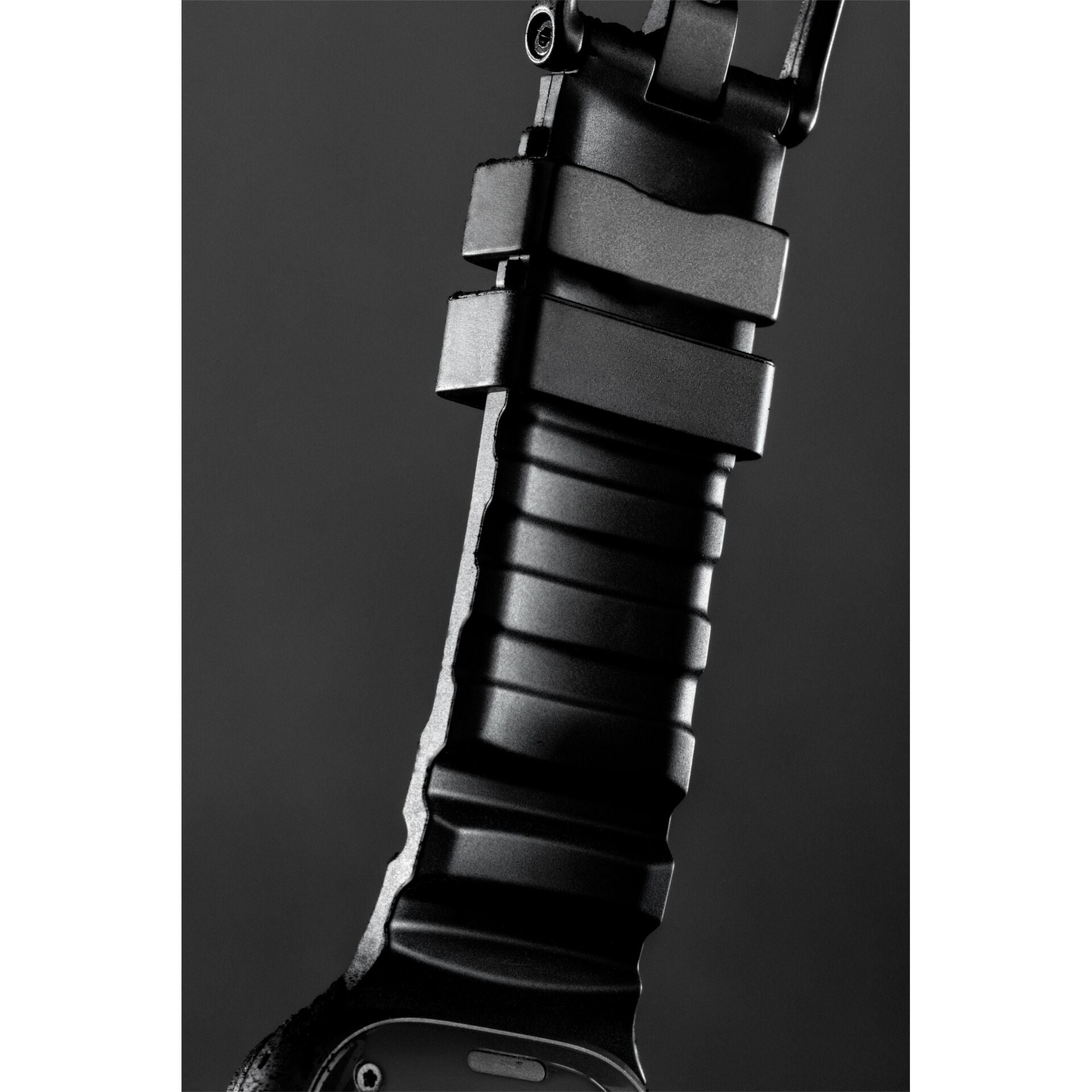 Das speziell entwickelte FKM ist mit Kohlenstoffpulver durchsetzt und bietet damit eine außergewöhnlich satte schwarze Farbgebung bei gleichzeitig hoher Strapazierfähigkeit. Die präzise gefertigte Hardware aus Grad 2 Titan ist mit einer Kohlenstoffbeschichtung versehen und ergänzt die Apple Watch Ultra optimal in Material und Design. Belüftungsrillen fördern die Luftzirkulation und reduzieren Feuchtigkeit, während das glatte, leichte Material hohen Tragekomfort auch bei intensiver Nutzung ermöglicht.