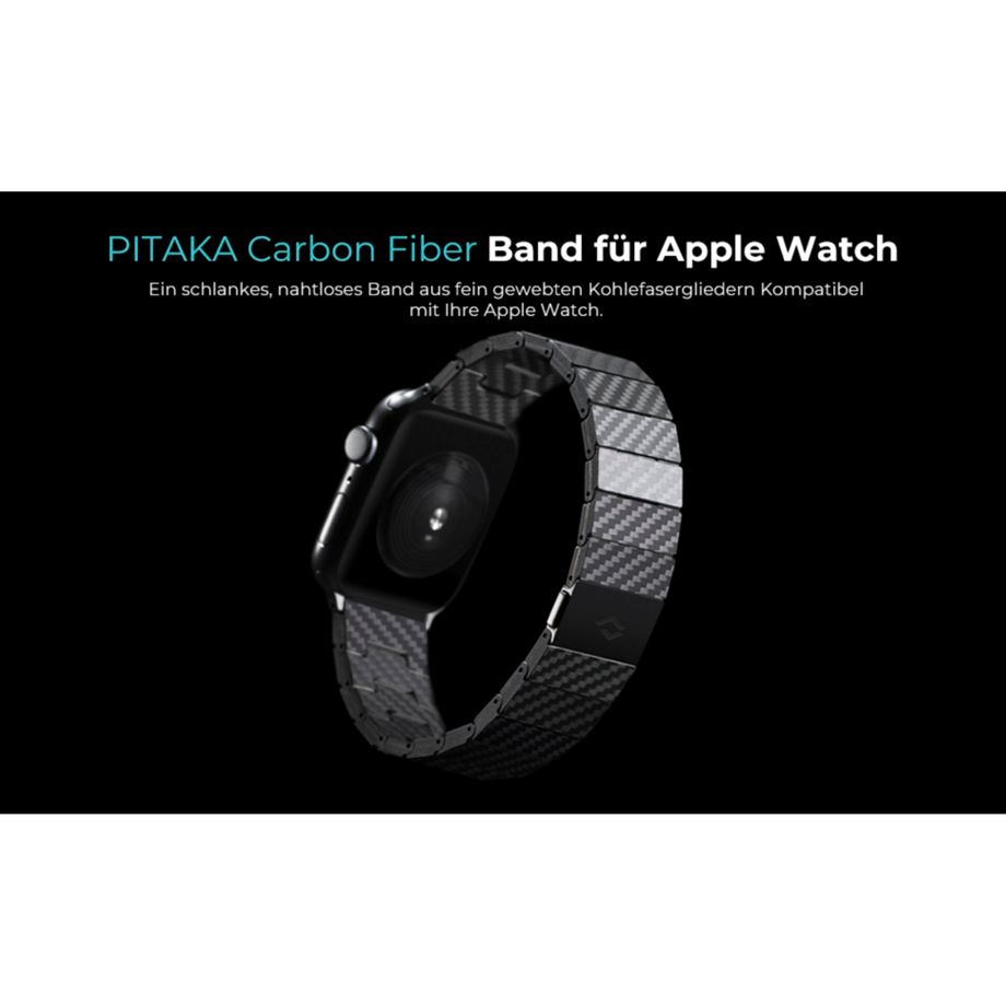 Das Pitaka Carbon Fiber Link Bracelet Modern ist ein robustes Uhrenarmband aus Kohlenstofffasern und Edelstahl. Das Uhrenband kann in der Länge angepasst werden, indem Glieder entfernt oder eingesetzt werden. Hierfür sind zusätzlich zum Armband zwei weitere Glieder sowie ein Werkzeug zum Entfernen und Einsetzen der Glieder im Lieferumfang enthalten. Dank der Kohlestofffasern ist das Armband nicht nur besonders robust, sondern auch leicht. Der magnetische Verschluss sorgt für sicheren Halt und gleichzeitig leichtes an- und abnehmen des Uhrenarmbands. Das Pitaka Carbon Fiber Link Bracelet ist kompatibel mit allen 42/44/45/49mm Versionen der Apple Watch.