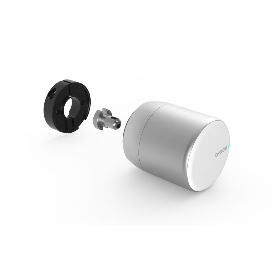 Mit diesem Adapter ist es möglich, das smarte Türschloss von tedee an einem bestehenden Schließzylinder zu befestigen, ohne ihn austauschen zu müssen. Für die Montage wird zunächst ein eigener Schlüssel benötigt, der einfach gerade abgeschnitten wird. Er dient als Verbindungsglied zwischen dem Zylinder und dem tedee-Türschloss. Die beiden Adapterteile werden am tedee-Schloss befestigt, anschließend auf den bestehenden Zylinder gesteckt und fixiert.