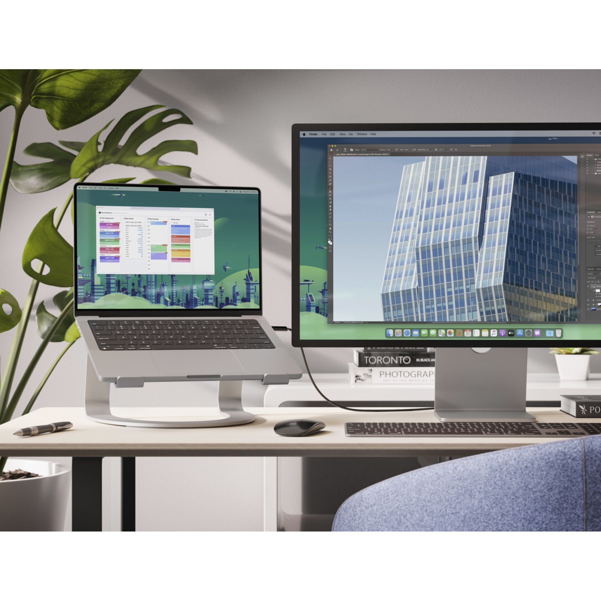 Der Curve SE Laptop Stand fördert eine effektive Kühlung, indem er 70 Prozent der Unterseite des Geräts freilegt. Dies ermöglicht eine optimale Wärmeabfuhr und verhindert eine Überhitzung des Laptops. Anti-Rutsch-Silikon-Pads und gebogene Arme sorgen für einen stabilen Halt und schützen gleichchzeitig vor Kratzern. Der Laptop Stand von Twelve South ist mit Laptops von 11 bis 17 Zoll und einem Gewicht von bis zu 3,2 Kilogramm kompatibel und bietet durch die Unterstützung eines externen Monitors eine flexible Lösung für ein Dual-Screen-Setup.
