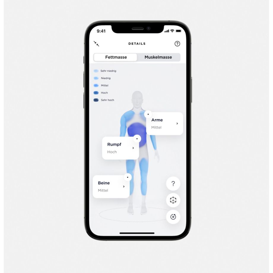 Body Scan nutzt dafür die Bioelektrische-Impedanzanalyse (BIA) mit Multifrequenz zur genauen Messung der Körperzusammensetzung. Dabei wird jedes Körperteil, einschließlich Rumpf, Arme und Beine, unabhängig voneinander betrachtet, um mehr über lokale Fettbefunde zu erfahren und mögliche Muskelungleichgewichte effizient zu erkennen. Die Messwerte umfassen Fett-, Knochen-, Muskel- und Wasseranteil in jedem einzelnen Körperteil.