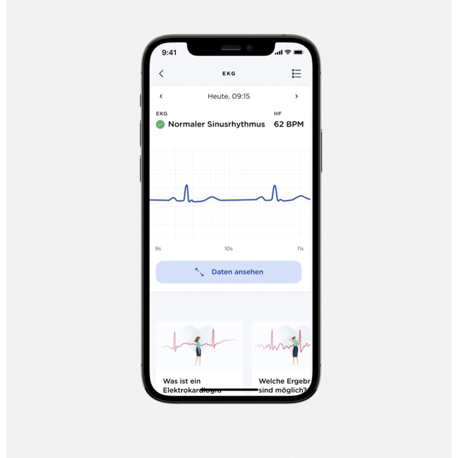 - EKG zur Erkennung von Vorhofflimmern und patentierte Technologie zur Herzfrequenzmessung (Einheit: bpm, Herzschläge pro Minute)