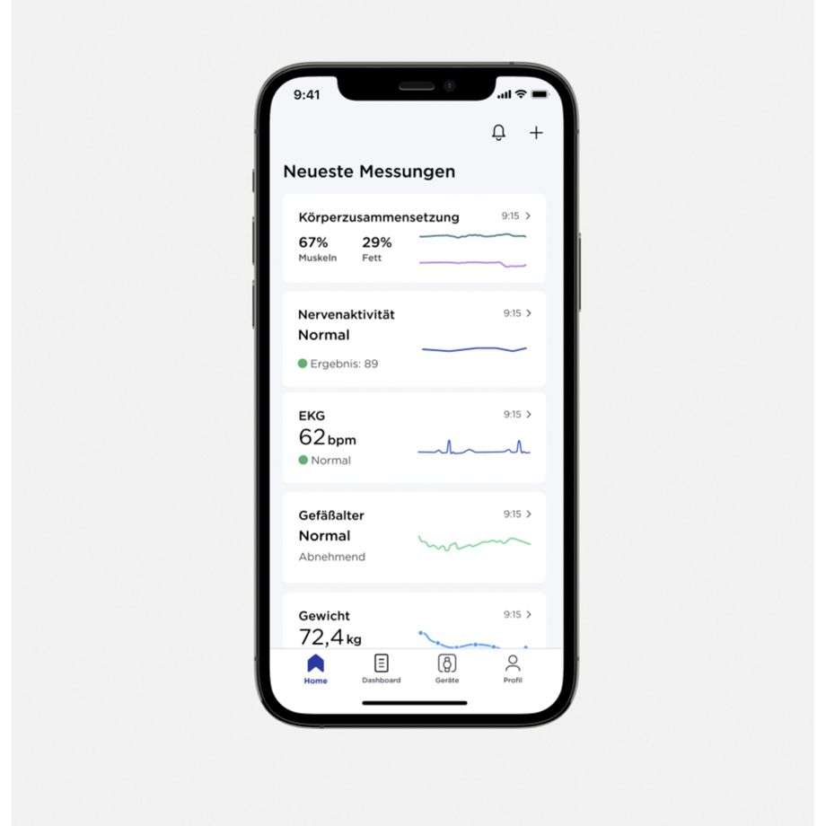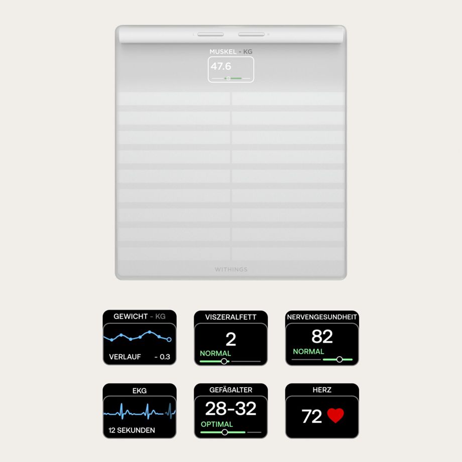 - Smarte Gesundheitswaage mit ausziehbarem Griff als vernetzte Gesundheitsstation zur Messung von diversen Vitalparametern: Gewicht, BMI, Körperzusammensetzung, EKG, Gefäßalter, Pulswellengeschwindigkeit, Herzfrequenz im Stehen, Nervenaktivität, Grundumsatz und Stoffwechselalter