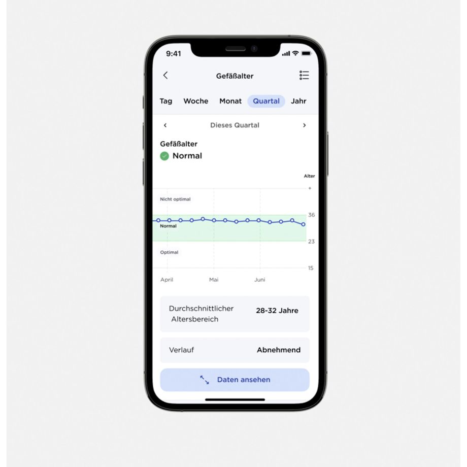Um ein noch klareres Bild der eigenen Herzgesundheit zu schaffen, kann die Geschwindigkeit gemessen werden, mit der sich die vom Herzen erzeugten Wellen entlang der Arterien bewegen. Eine niedrige Pulswellengeschwindigkeit deutet auf eine bessere Herzgesundheit hin: Durch eine ausgewogene Ernährung und ausreichend Bewegung kann der Messwert verringert und die Herz-Kreislauf-Gesundheit verbessert werden. Diese Änderungen des eigenen Lebensstils werden durch App-Module zur Gewohnheitsänderung unterstützt.