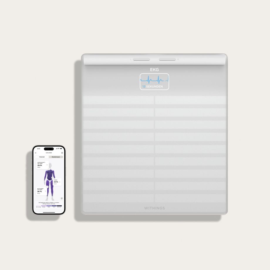 Die innovative Körperwaage Body Scan hilft dabei, die eigene Gesundheit zu überwachen und langfristig zu verbessern. Die vernetzte Gesundheitsstation wurde in Zusammenarbeit mit Kardiologen, Neurologen und Diabetologen entwickelt und bietet eine segmentale Analyse der Körperzusammensetzung, eine Bewertung der Nervenaktivität und eine EKG-Aufzeichnung – alles in einem Wiegevorgang. Die Daten werden nach jedem Wiegen automatisch mit der Withings-App (iOS und Android) synchronisiert, ohne dass das Smartphone in der Nähe der Waage sein muss. Bis zu acht Nutzerinnen und Nutzer können ihre jeweiligen Daten dokumentieren. Die Körperwaage besteht aus robustem und langlebigem Hartglas und besitzt einen hochauflösenden 3,2-Zoll-LCD-Farbbildschirm für gute Lesbarkeit sowie einen ausziehbaren Griff aus widerstandsfähigem Thermoplast. Außerdem verfügt die Waage über einen wiederaufladbaren Akku (USB-C-Kabel im Lieferumfang enthalten) mit einer Gesamtlaufzeit von bis zu 12 Monaten.