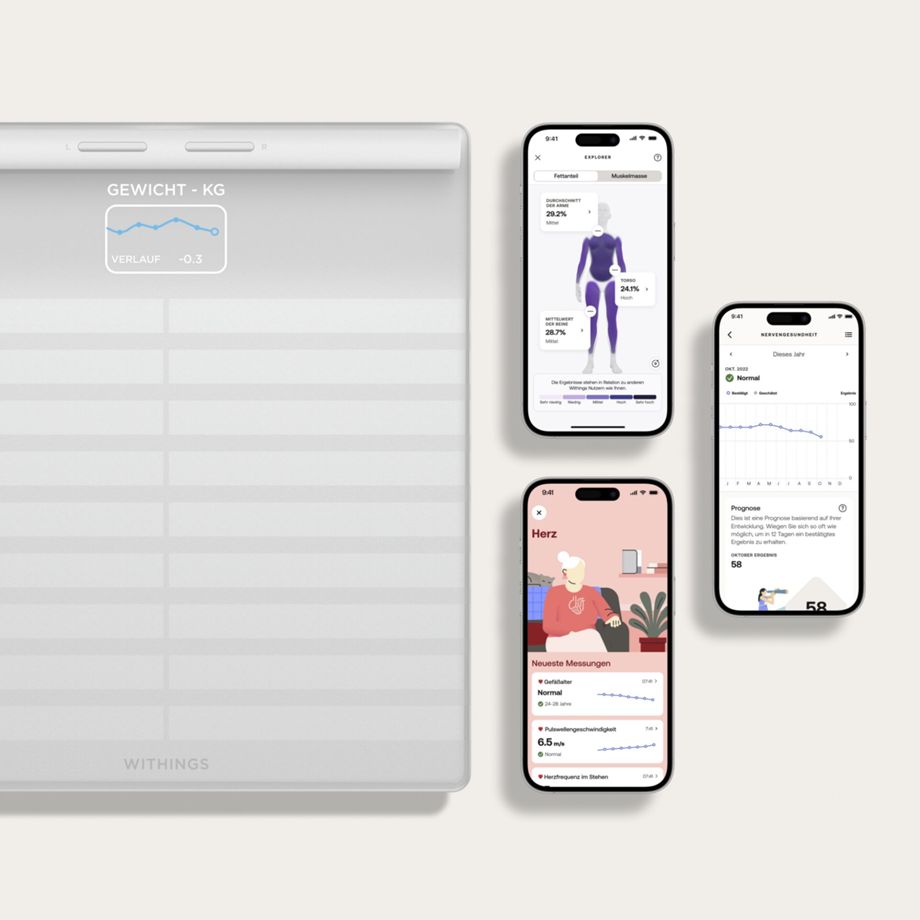 - Apps: Withings-App für iOS (14 oder höher) und Android (10.0 oder höher), Web-Dashboard und über 100 weitere kompatible Apps und Services